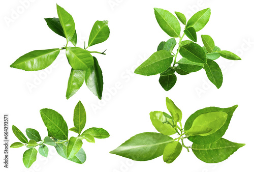 Fototapeta premium Green lemon leaves Bundle on white background, leaf isolated set, green leaf plant eco nature tree branch isolated