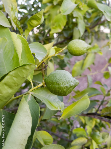 Obraz premium Green lemons on a branch in the garden. The concept of agriculture. Vertical orientation. Selective focus.