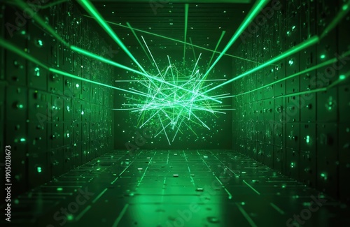 Fototapeta premium Green light beams form complex geometric shape in dark server room. Digital...
