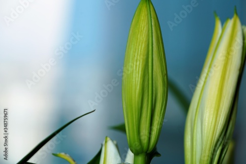 © Morten H, Fototapeta premium green lily leaves on blue background