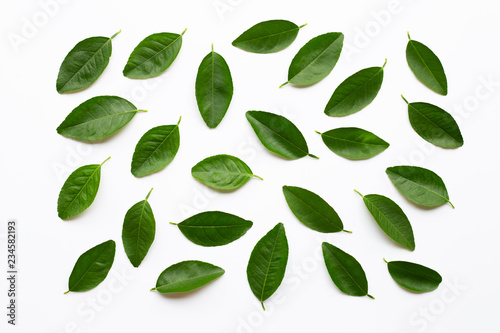 © Bowonpat, Naklejka premium Green lime leaves on white background.