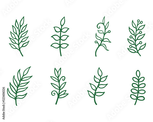 Fototapeta premium Green line floral elements. Wild leaves on white background.