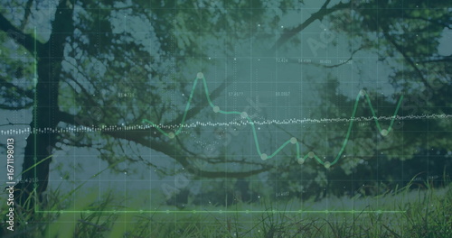 © vectorfusionart, Naklejka premium Green line graph fluctuating in forest clearing, with grid overlay, markers, trendline and labels