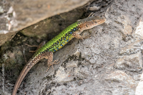 Naklejka premium Green Lizard crawling on a stone cliff. The European green lizard Lacerta viridis