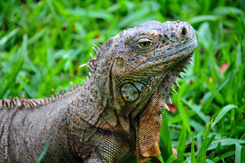 Fototapeta premium Green lizard iguana on the green grass background, shallow focus