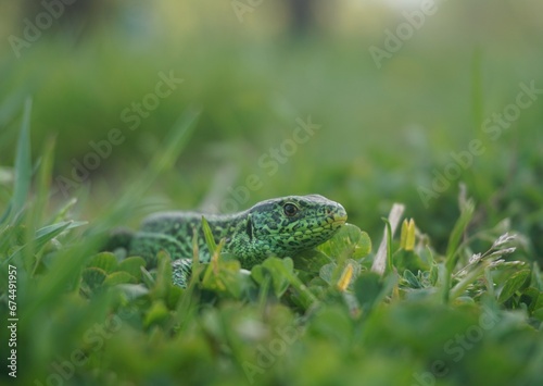 Obraz premium Green lizard in Grass with green background