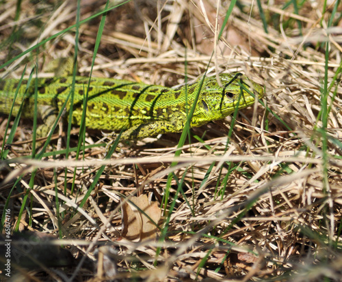 Obraz premium Green lizard in the dry grass
