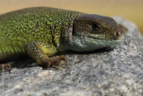 Fototapeta premium Green lizard lacerta viridis in summer garden. Small reptile outdoor
