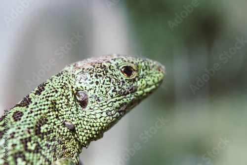 © writerfantast, Fototapeta premium Green lizard macro, close up.
