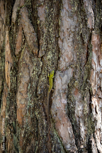 Obraz premium Green lizard on a coniferous tree
