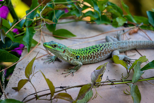 © stop.i.will.shoot, Fototapeta premium green lizard on a stone fence