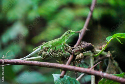 © Mark Libra, Fototapeta premium green lizard on a tree. Gren lizard with mouth open closeup