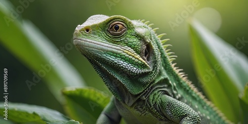© Den Boro Day, Obraz premium Green lizard on green leaf, sunny sky background.
