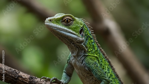 Fototapeta premium Green lizard perched on a tree.