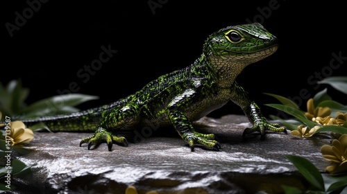 © Bimha, Obraz premium Green lizard posing on rock, floral backdrop