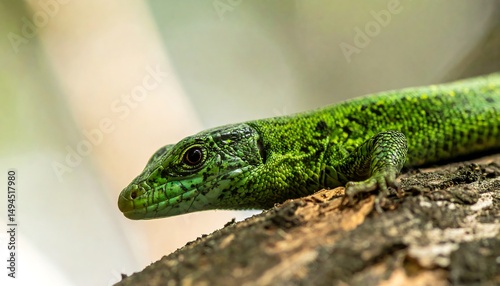 Fototapeta premium Green lizard resting on a tree branch.
