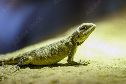 © Maksim, Naklejka premium Green lizard sitting on the sand.