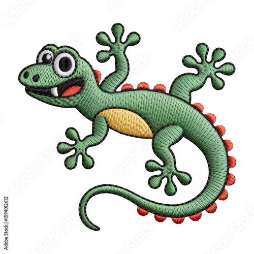 Fototapeta premium Green lizard with red spikes and yellow belly cartoon lizard