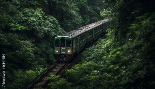 Fototapeta premium Green locomotive speeds through forest on railroad track, vanishing point generated by AI