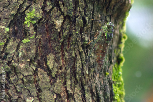 © Павел Чепелев, Obraz premium green locust sits on a tree trunk