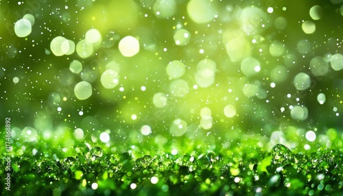 Fototapeta premium Green Lush Foliage With Dew Drops And Bokeh