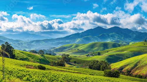 © Rabih, Fototapeta premium Green Lush Hills Valley Landscape With Cloudy Sky