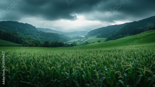 © Ruslan, Fototapeta premium Green maize fields sway in the wind on a stormy summer day. The valley is surrounded by mountains with forests.