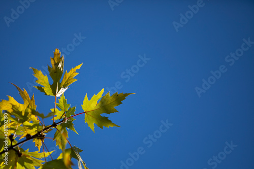 © AlberTolentino, Obraz premium Green maple leaf with blue sky background