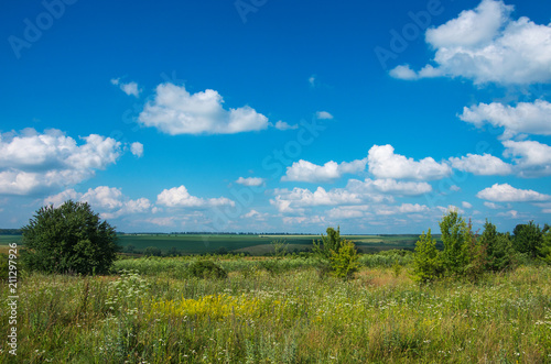 © oleh11, Fototapeta premium green meadow and blue sky with clouds in summer