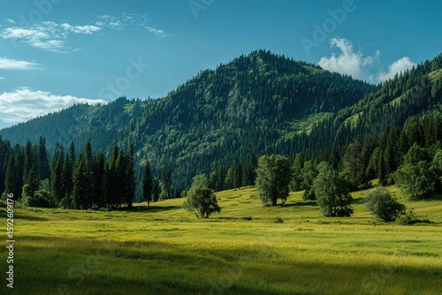 © Resi, Fototapeta premium Green Meadow And Forest Hills