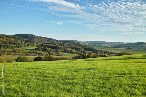 © mik_photo, Fototapeta premium green meadow and hills with forest