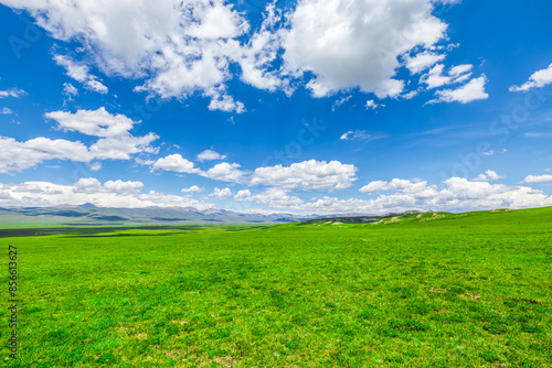 Obraz premium Green meadow and sky clouds nature landscape on a sunny day