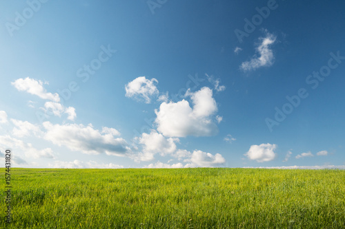 © Ewald Fröch, Fototapeta premium Green meadow field under a blue sky with clouds