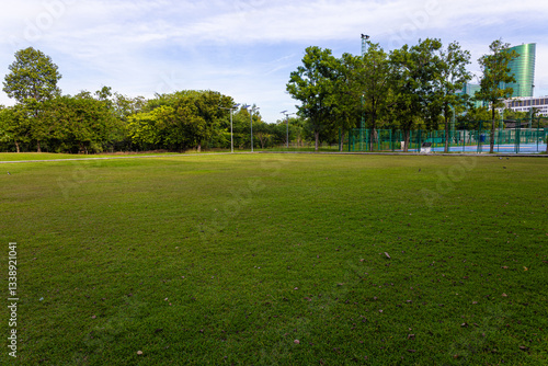 Naklejka premium Green meadow grass with tropical tree forest sunrise city park