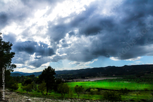 © Pablo Eskuder, Obraz premium Green meadow in a day with white and gray clouds and sun rays.