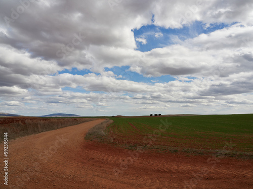 © JuanCarlos, Fototapeta premium Green meadow landscape with blue sky and clouds
