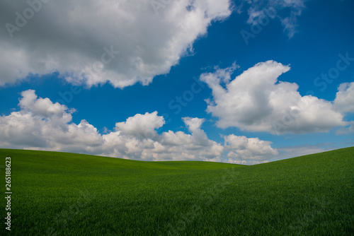 © Kozma, Fototapeta premium Green meadow under blue sky with clouds