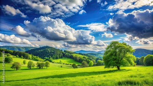 © Atittaya, Fototapeta premium Green meadow under blue sky with clouds, trees, hills in USA