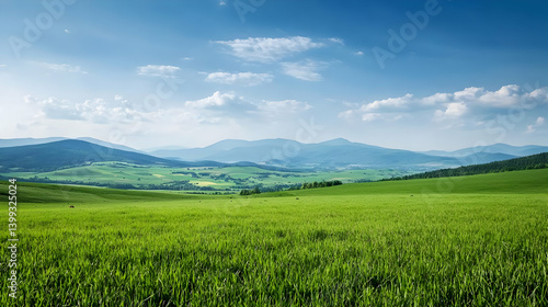 © Parsudi, Fototapeta premium Green Meadow With Hills Under Sunny Sky