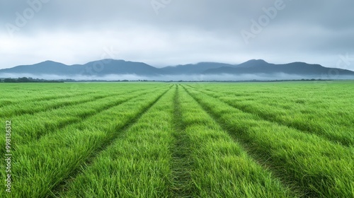 © @_ greta, Naklejka premium Green Meadow with Mountains in the Distance