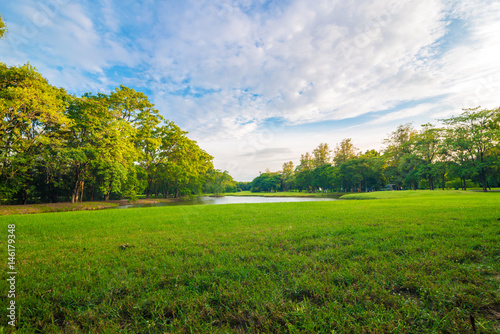 Fototapeta premium Green meadow with tree in central public park