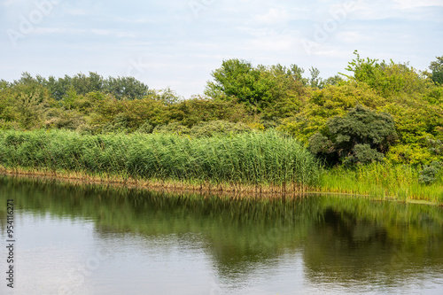 © Werner, Fototapeta premium Green meadows and natural water pond at the Brondby park, Copenhagen, Denmark