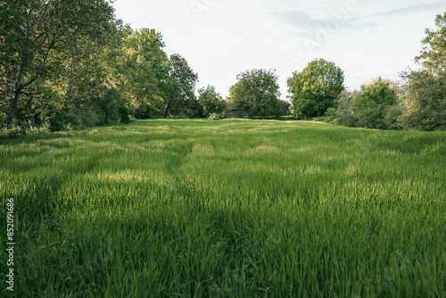 Fototapeta premium Green meadows with blue sky and clouds background