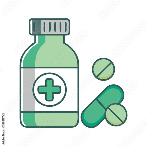 Obraz premium Green Medicine Bottle Vector with Pills and Capsules for Pharmacy