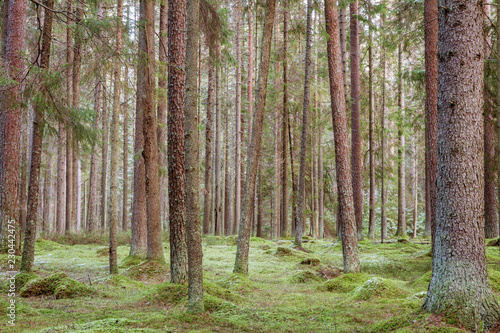© akintevs, Fototapeta premium green moss and tall pines in a pine forest. forest landscape.
