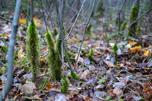 © Neils, Fototapeta premium green moss around small tree trunks in autumn season. Wilted leaves on the ground.