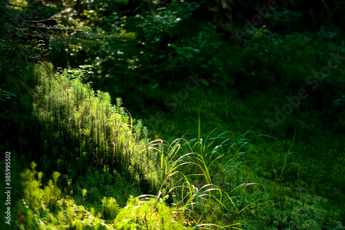 © Patrycja, Fototapeta premium Green moss through which the sun's rays shine through