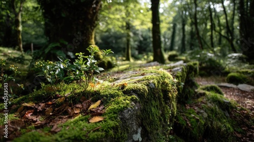 © PBMasterDesign, Fototapeta premium Green moss with natural colours in peaceful forest concept. Lush forest scene with moss-covered rocks.
