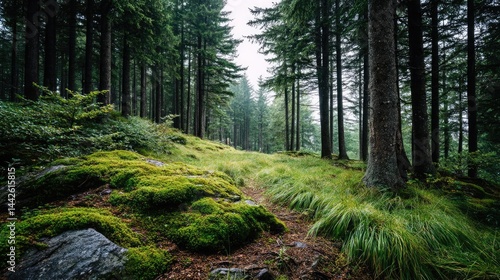© PBMasterDesign, Obraz premium Green moss with relax mood in green forest concept. Lush forest path lined with diverse greenery.