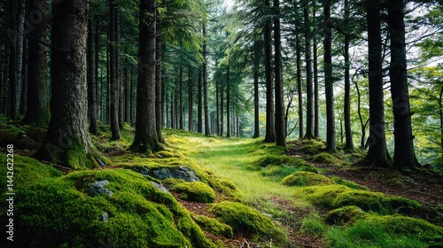 © PBMasterDesign, Obraz premium Green moss with relax mood in green forest concept. Lush green forest path with mossy ground.